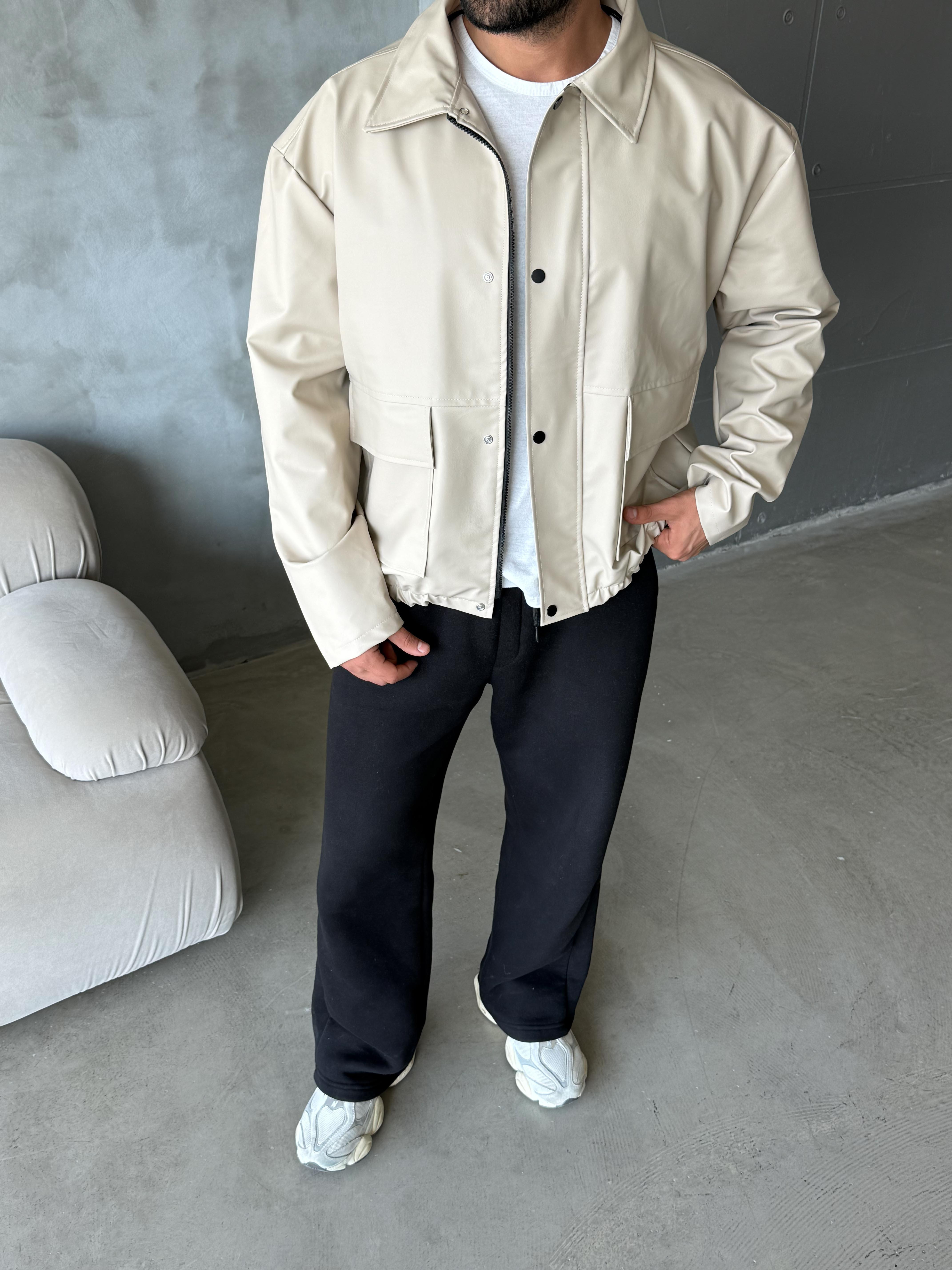 Bej Yakalı Dik Cep Kapaklı Ribanalı Deri Ceket SC (DGCK0000139)