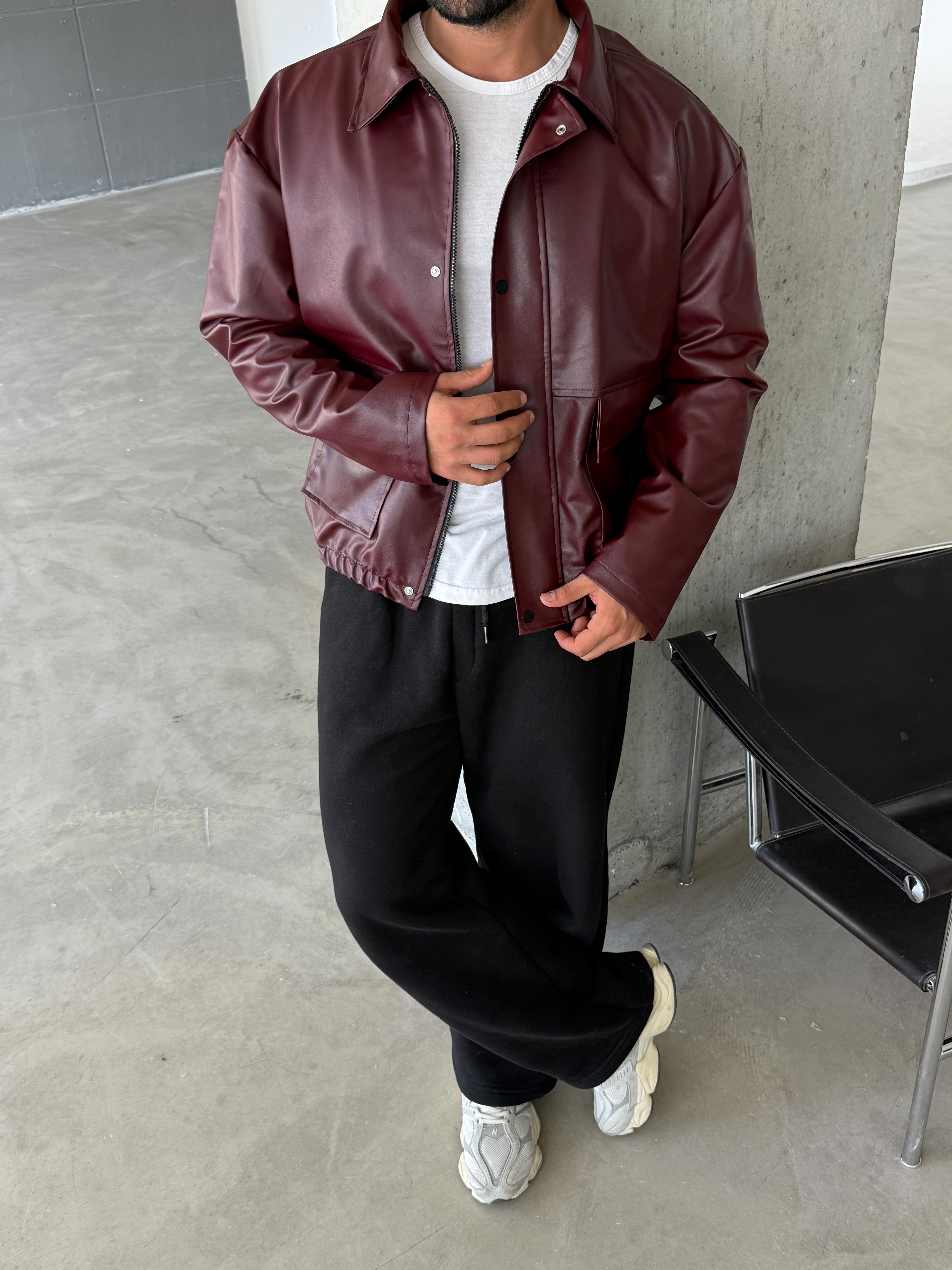 CEKETBordo Yakalı Dik Cep Kapaklı Ribanalı  Deri Ceket SC