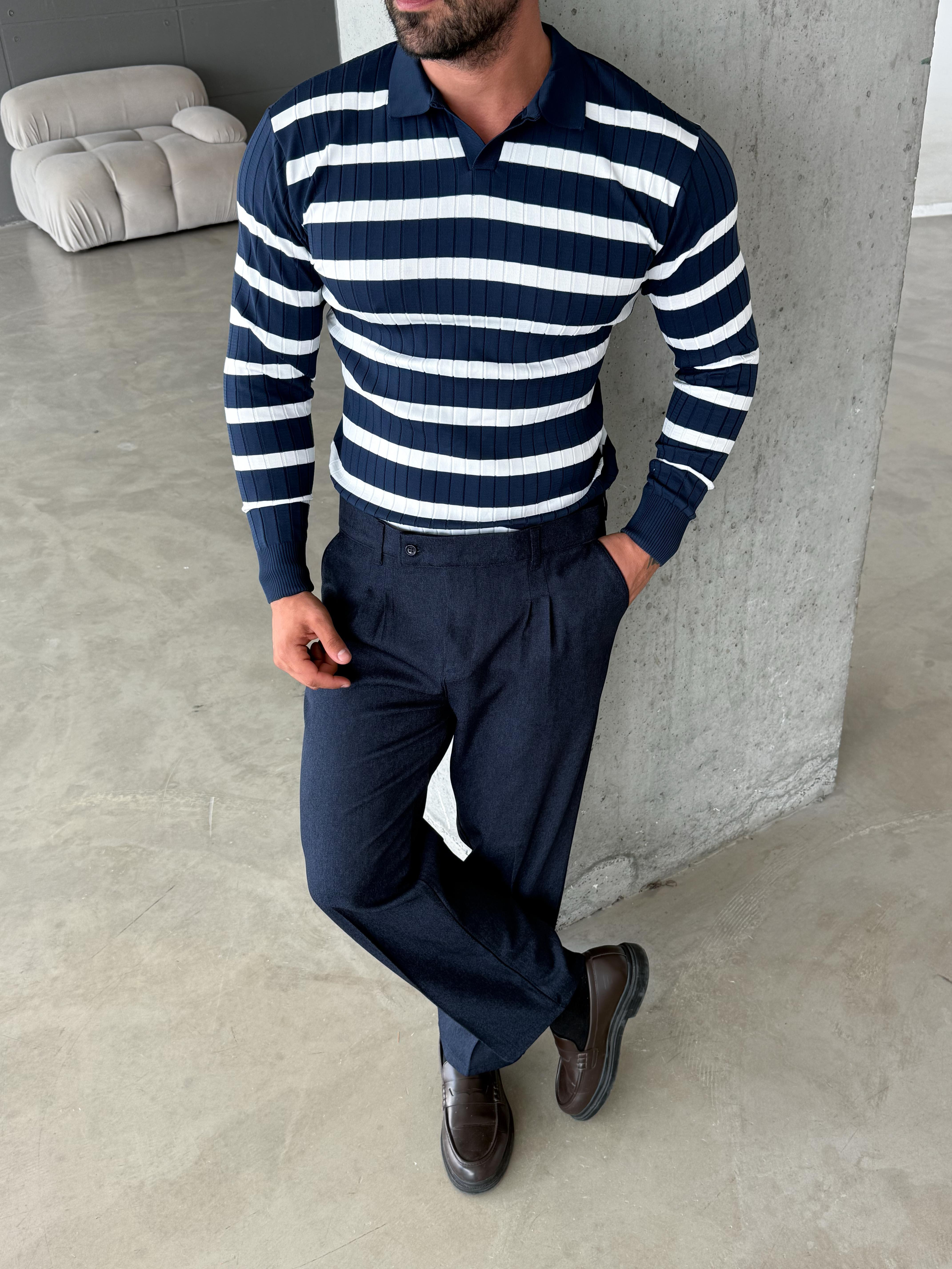 KAZAKLacivert Çizgili Geniş Aralıklı Pamuk İplik Triko SC